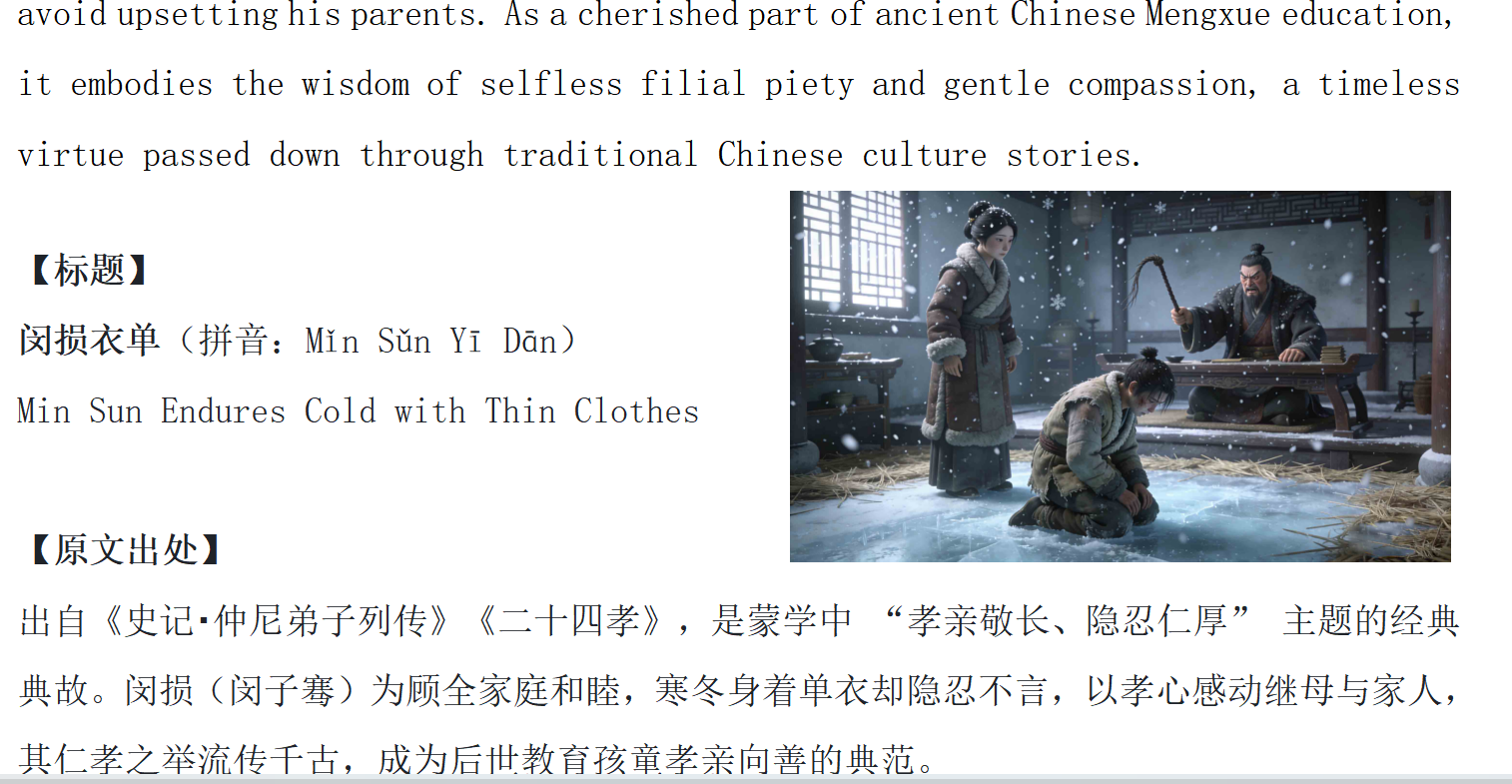 English: “Min Sun’s Thin Coat” describes Min Sun enduring a cold winter with a reed-cotton coat to avoid upsetting his parents, embodying the virtue of selfless filial piety and gentle compassion.