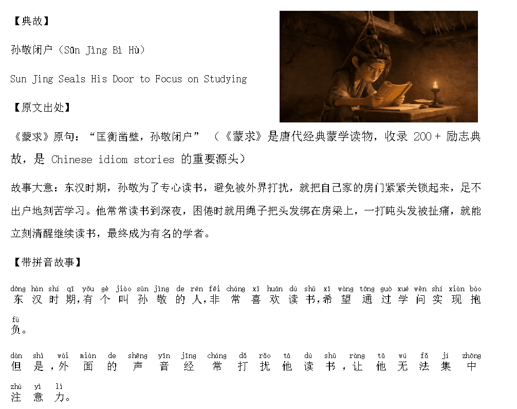 Learn Chinese idioms online with this classic mengxue story: “Sun Jing Seals His Door to Focus on Studying”.