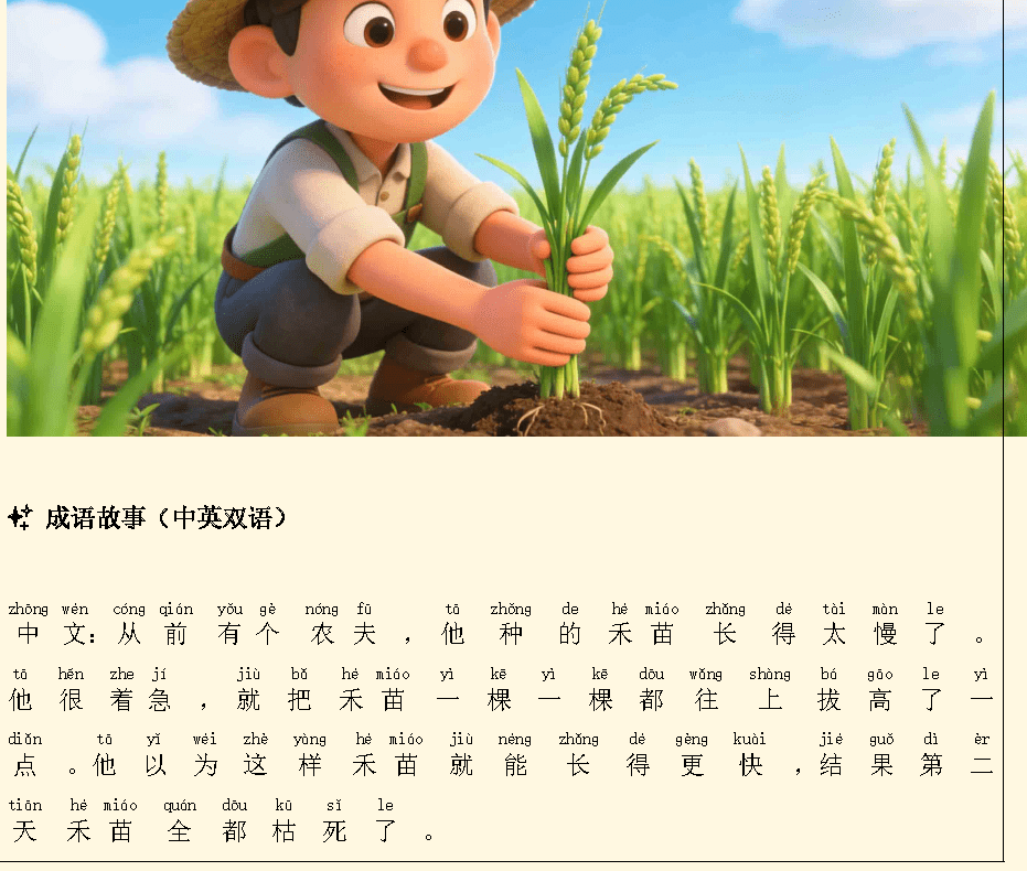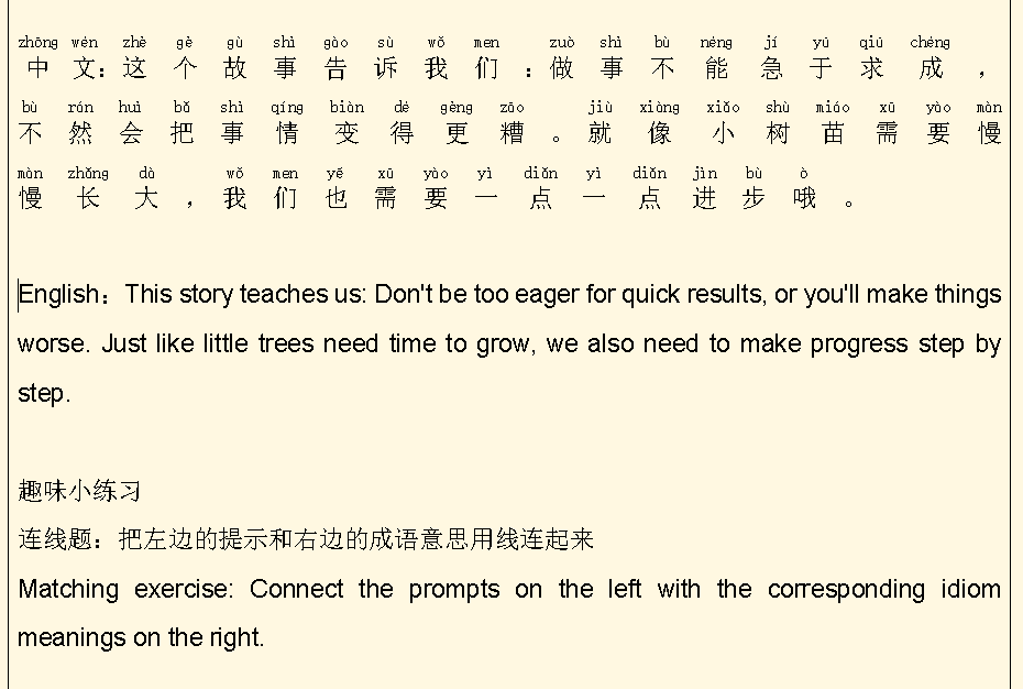 2、Read each idiom story aloud in both English and Chinese to build listening skills.