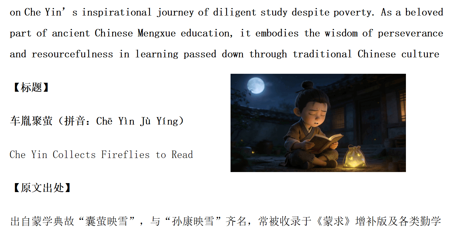 This is a classic Chinese idiom story from traditional Chinese culture, focusing on Che Yin’s inspirational journey of diligent study despite poverty. As a beloved part of ancient Chinese Mengxue education, it embodies the wisdom of perseverance and resourcefulness in learning passed down through traditional Chinese culture.