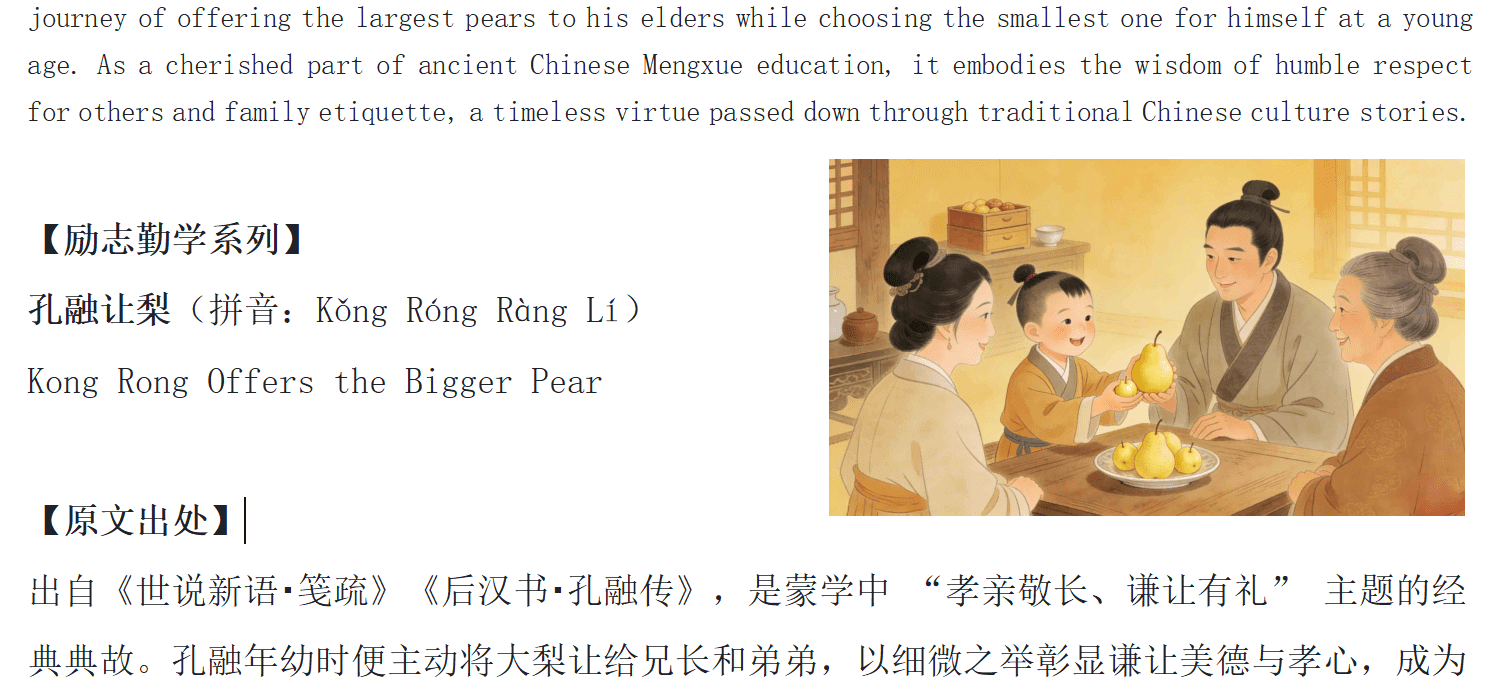 Kong Rong Offers the Pear is a classic Chinese idiom story from traditional Chinese elementary education, ideal for global learners exploring Chinese culture. It’s a timeless gracious tale that teaches children the importance of humility and respect for others, and it has been a cornerstone of Chinese etiquette education for nearly 2,000 years.