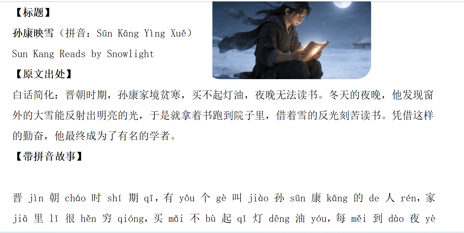 Learn Chinese idioms online with this classic mengxue story: “Sun Kang Reads by Snowlight”.